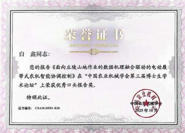 2025年10月18日,中国农业机械学会第三届博士生学术论坛在合肥召开。我院殷国栋教授团队2024级博士研究生沈利霖、白鑫依托国家重点研发计划“工厂化农业关键技术和智能农机装备”重点专项 “新能源园艺作业动力机械创制开发”,分别围绕轮式、履带式新能源农机装备动力底盘设计进行了工作进展汇报,双双荣获得论坛“优秀口头报告”奖。